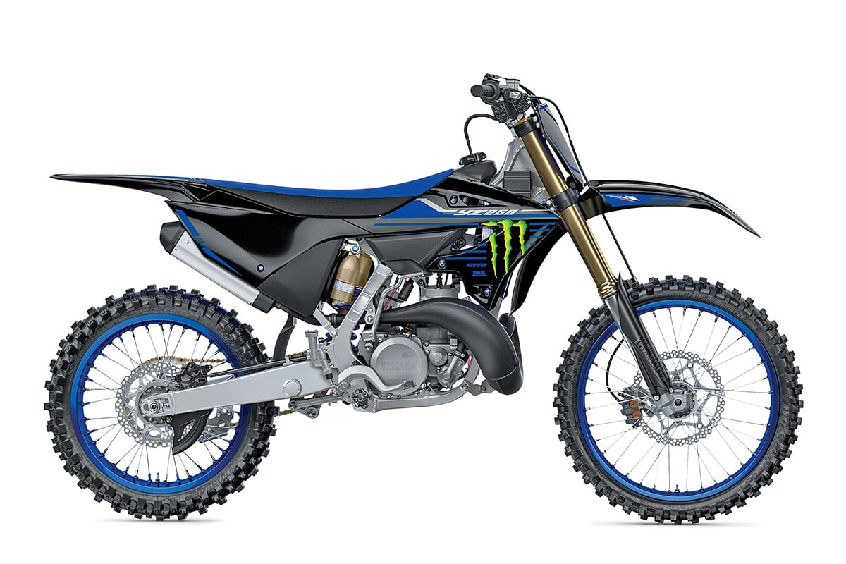 Yamaha wowed us with extensive change for the YZ250 two-stroke in 2022. The 2023 version is understandably unchanged, but it is available in the latest Monster Energy graphics as a special edition. The YZ250 ME Edition gets black plastic and graphics similar to those of the Star Yamaha team. Otherwise, the bike is the same as the standard version.