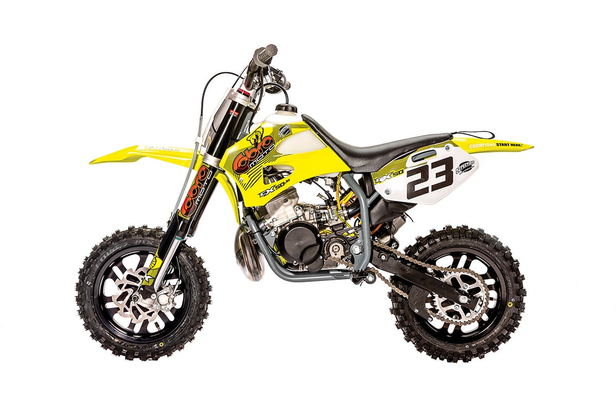 One reason the Cobra CX50 has earned over 300 championships is because the bike is built like a scaled-down factory motocross bike. It has twin radiators, forged triple clamps and would look perfectly at home at Anaheim One if it were just bigger. The standard CX50 already has a long list of high-end parts, but there’s also an upscale Factory Works Edition for the most elite young riders. It sells for $5719.