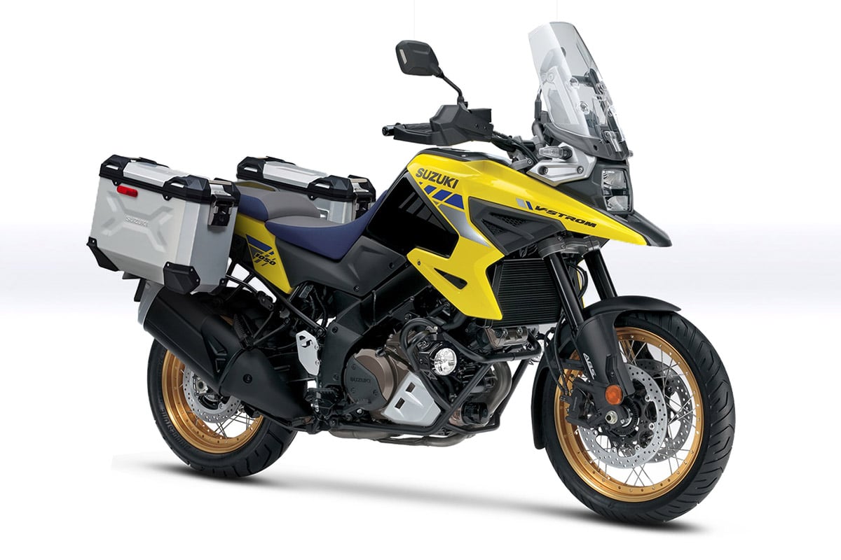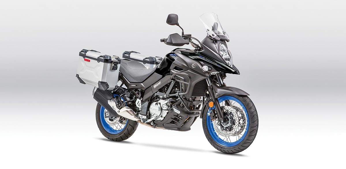 This is Suzuki’s high-end adventure machine fit with a generous number of electronics, including a traction control system with four modes of adjustment, and the Suzuki Drive Mode Selector (S-DMS) that lets the rider choose from three different engine power delivery characteristics. Included are Suzuki’s adventure-style, 37-liter aluminum panniers that attach to powdercoated, stainless-steel carriers. Built to be waterproof with rubber-sealing lids, these panniers have powder-coated interiors that prevent aluminum stains on cargo.