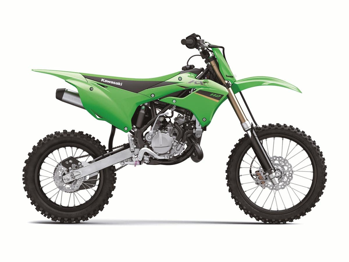Just when you thought that Kawasaki forgot about ’tweens. For 2022 Kawasaki is offering the KX112 Supermini. It replaces the ancient KX100 in the Kawasaki lineup but is much more modern, with a new cylinder, new crank, new gearbox and new bodywork. The KX112 uses a 16-inch rear wheel with a 19-incher in front and is equipped with Dunlop MX33 tires.
