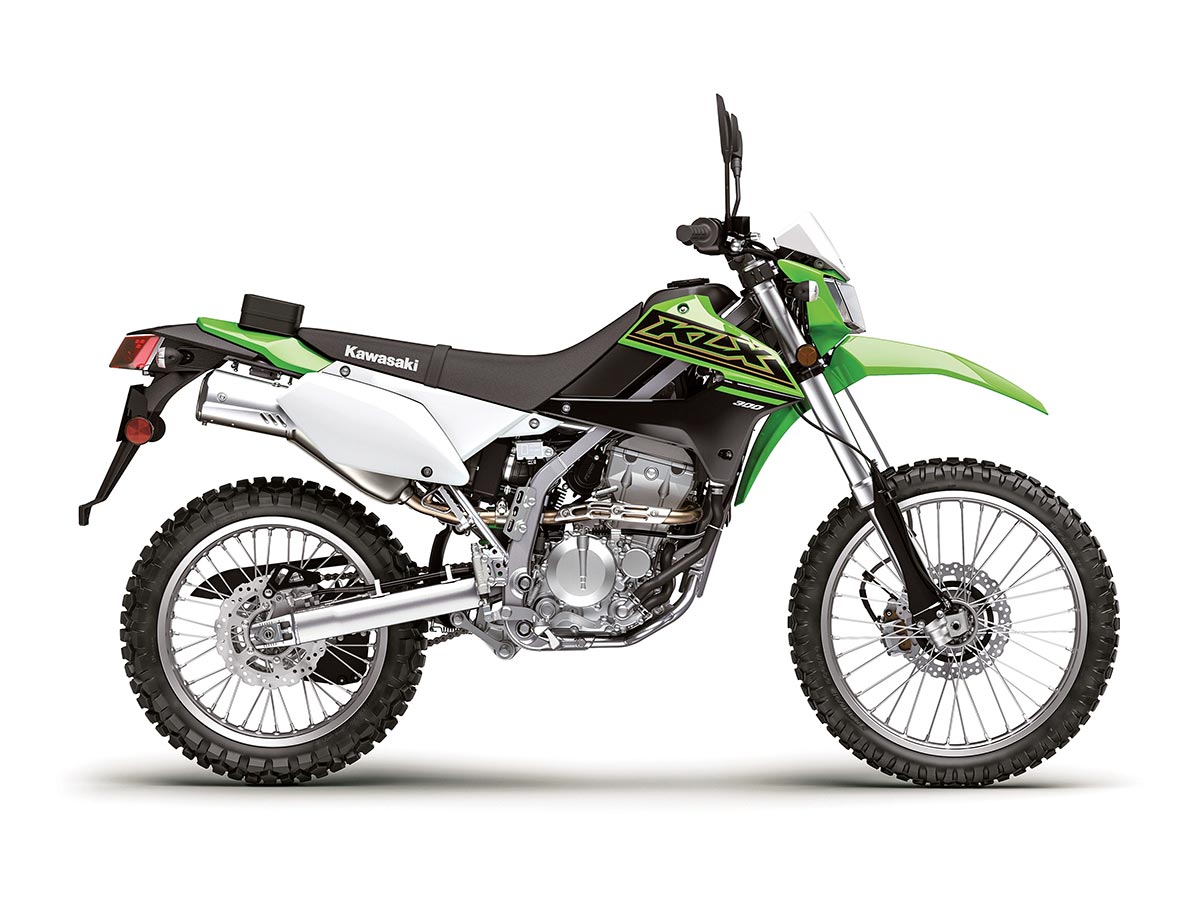 The all-new Kawasaki KLX300 is fit with a water-cooled, fuel-injected, 292cc powerplant that offers rideable performance for both the road and the trails. It has dual-sport-tuned suspension (Uni-Trak rear, 43mm cartridge fork up front), electric start, a radiator fan, dual disc brakes and a low 35.2-inch seat height for enhanced stability.