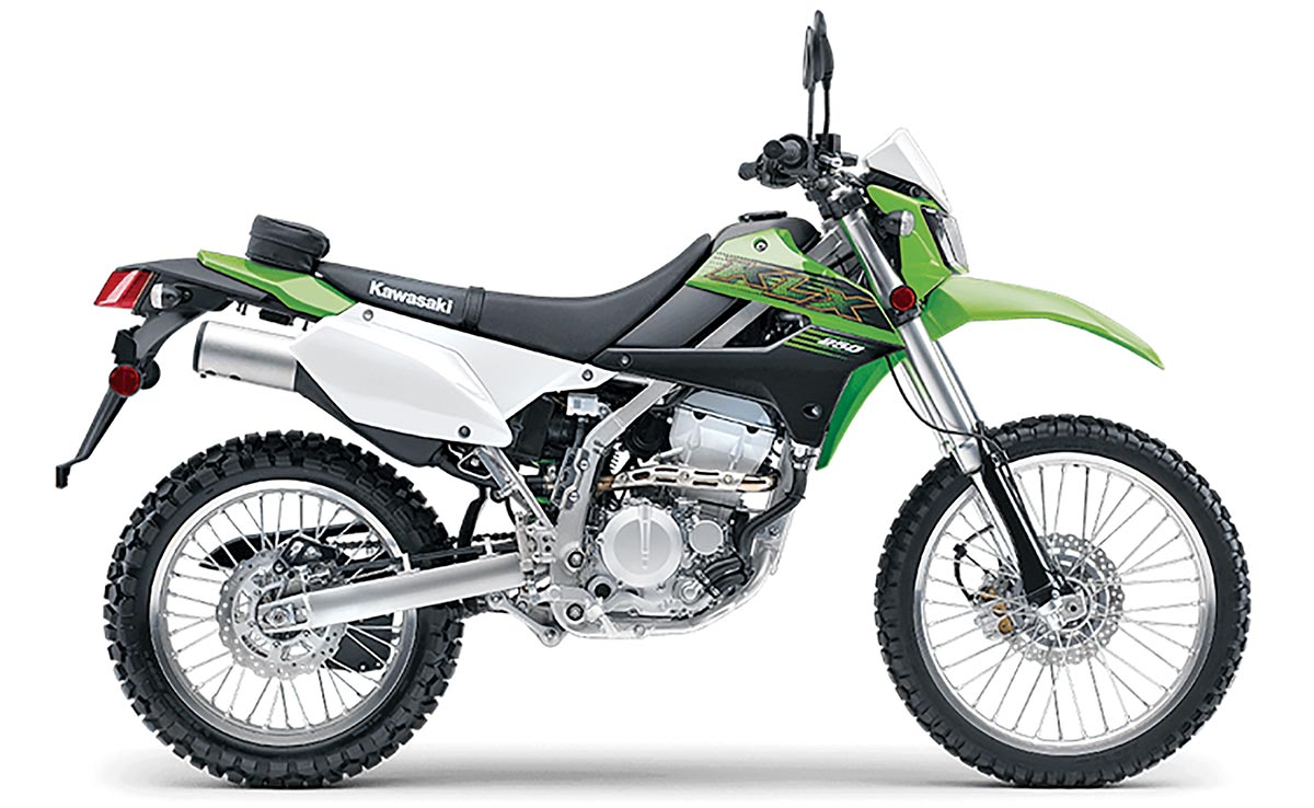 This machine features a 233cc, air-cooled engine that is fuel-injected and has a six-speed transmission. The suspension has almost 9 inches of travel. It has dual disc brakes and weighs just under 300 pounds. With a low seat height and a torquey motor, the KLX 230 is an around-the-town scoot with just a pinch of off-road DNA.