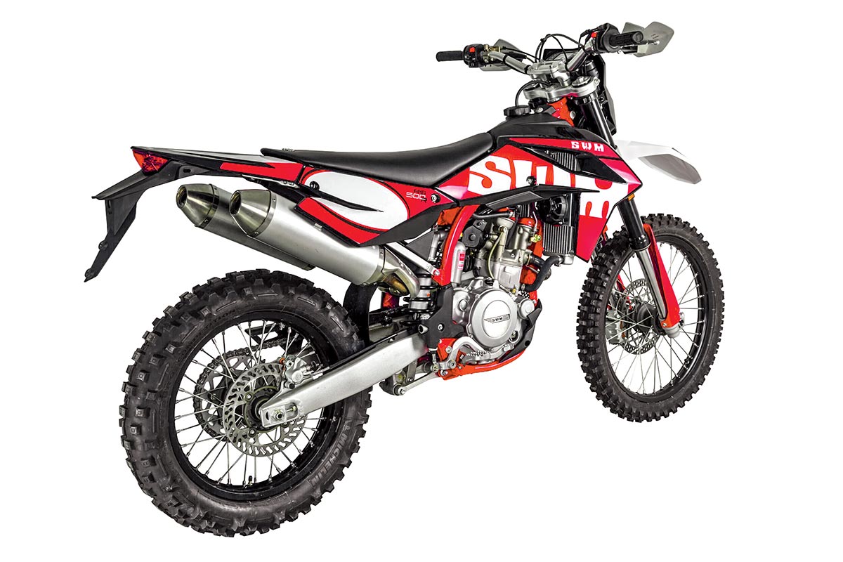 SWM’s dual-sport line is priced smartly, especially considering what you’re getting. The engine is a double-overhead-cam, liquid-cooled, EFI-equipped six-speed. The suspension is KYB fore and aft. The brakes are Brembo, and the tires are DOT Michelins. The RS500 comes fit with a radiator fan and a dual exhaust, and the package is said to weigh 256 pounds sans fuel.