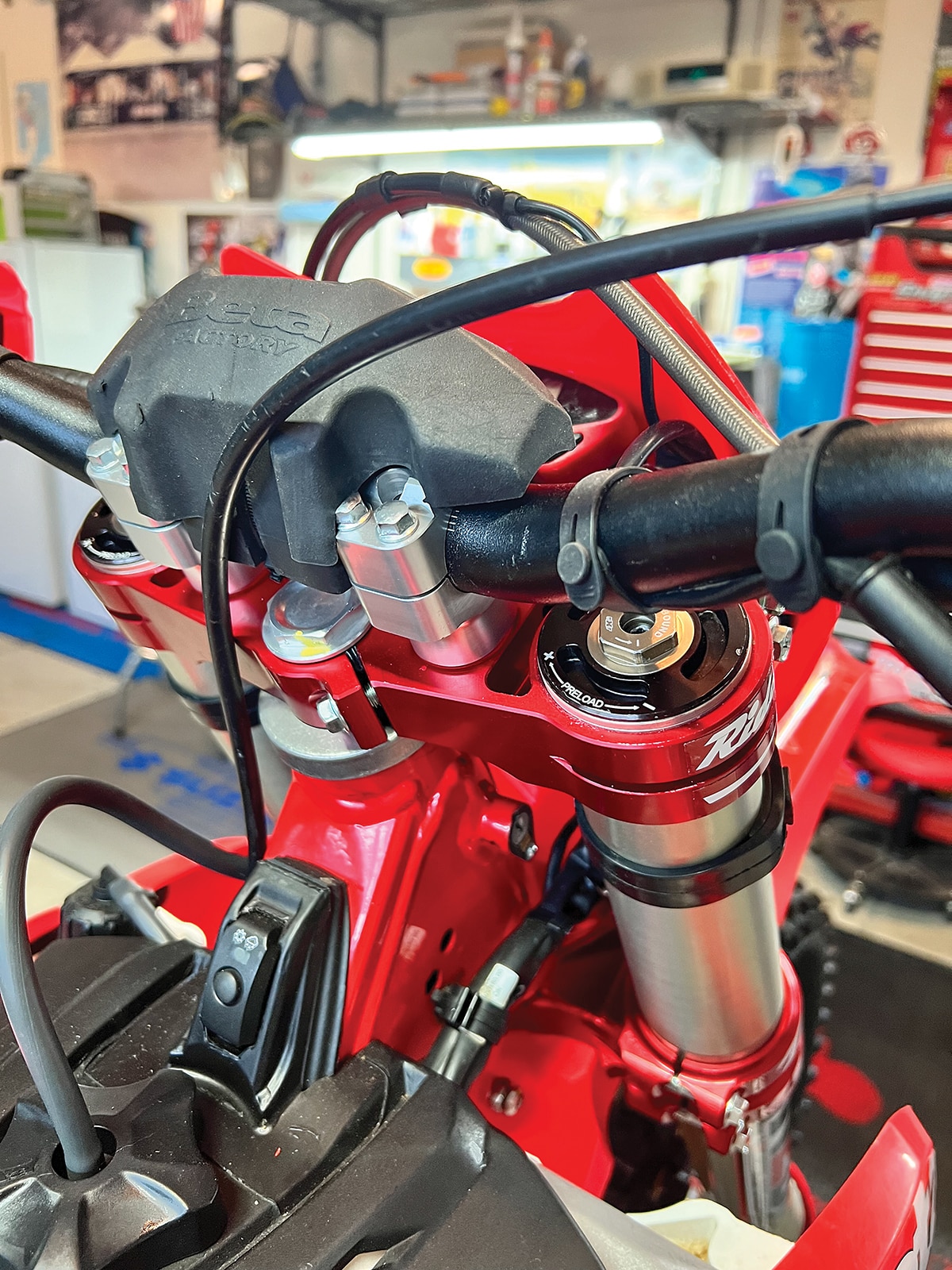 Everything mounted up seamlessly, including the Beta instrument cluster that bolts to the top clamp. We set our bars in the farthest forward position for our 6-foot test rider. Once out testing, we were stoked on the cornering character, without any sacrifice to stability, and the amount of chatter and vibration to the hands seemed minimized.