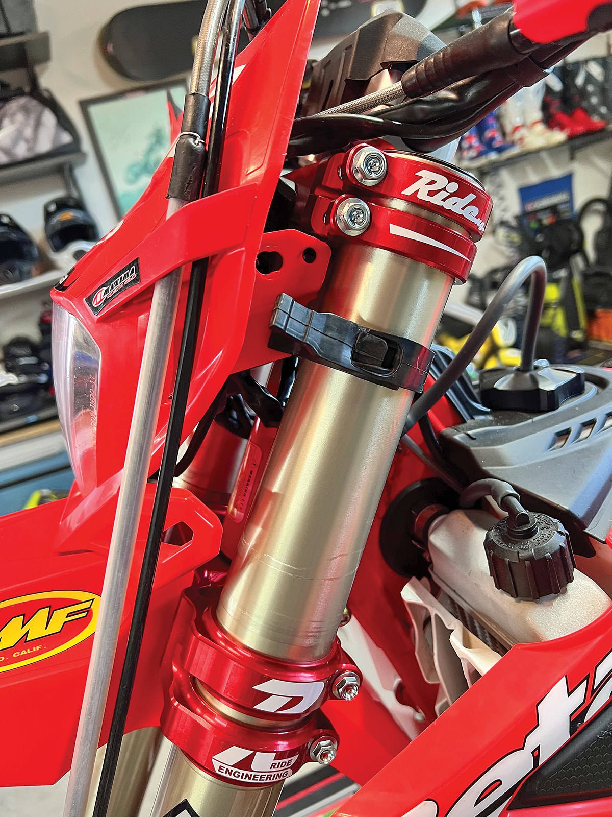 OUR TAKE: We mounted our Ride Engineering clamps on a long-term test Beta 300RR. They came from Beta Accessories, where there is a plethora of aftermarket goods for the Italian machines. The set comes with the stem and lower bearing attached to the lower clamp, as well as polyurethane cones and all hardware to attach the bar mounts. The stock lower steering race must be removed and the supplied new race installed.