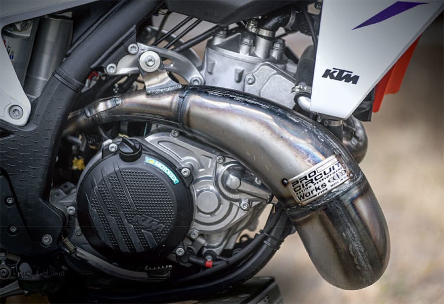 PRODUCT: Pro Circuit had a challenging task for the 2023 KTM 300SX. Many riders considered the stock powerband a little too much to handle. The bike is all new for 2023, with an electronically controlled power valve, as well as throttle-body fuel injection integrated with spark advance through the ECU. It has two maps available through a handlebarmounted switch—a mild white map and a fire-breathing green map. The problem is that the two maps actually have different port timing, something that wasn’t possible with previous systems. Improving the exhaust system of a bike with so many variables is tricky, to say the least. Otherwise, the Works pipe is typical of the systems that Pro Circuit has been manufacturing for almost 40 years. It has a raw, unfinished steel exterior and uses all the stock mounting hardware. We teamed it up with the Pro Circuit R304 stainless/aluminum silencer. This comes from Pro Circuit’s Shorty line, although it’s essentially the same length as the original but round instead of oval.
