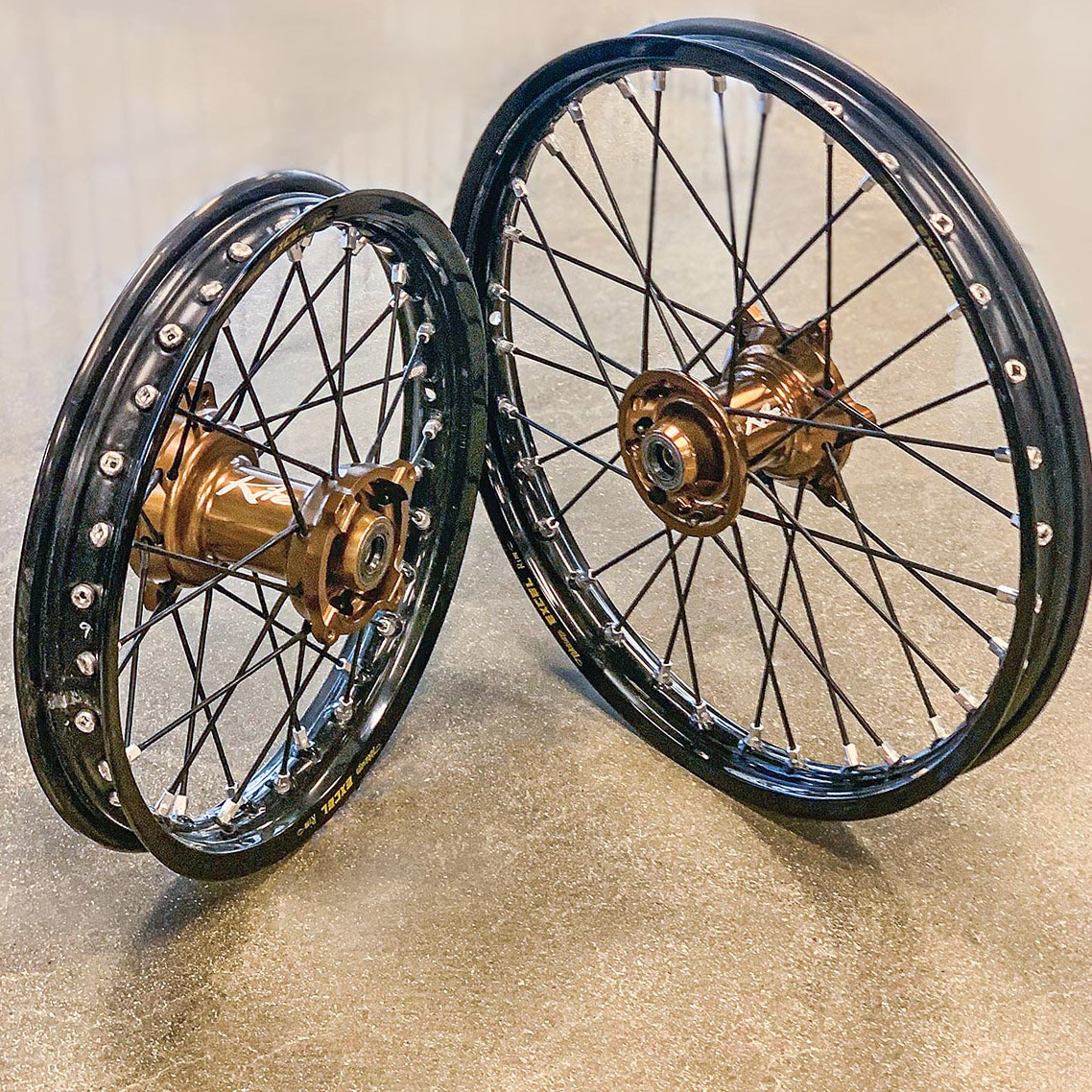 PRODUCT: Kite Parts USA makes complete Elite wheelsets for the 1998–2023 Kawasaki KX85 standard model with 17-inch front and 14-inch rear wheel sizes. The wheelset tested features hubs machined from 6082 T6, aircraft-quality billet aluminum utilizing a double bearing on the sprocket side and double lip seals. Stainless steel spokes, aluminum spoke nipples and signature Excel Takasago rims. Available in a wide variety of color combinations.