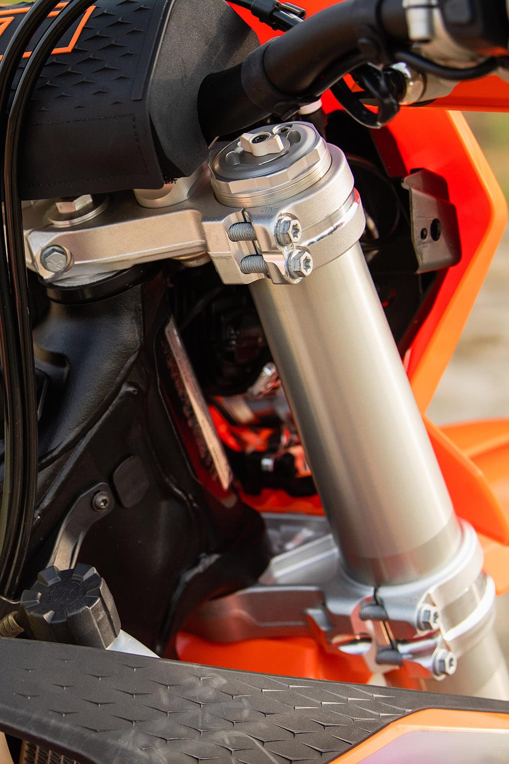 One other note in the engine department is the temperature. This scoot runs warm—hot, even. We rode last year’s 300 TPI machine for an incredible amount of time and never felt it necessary to in-stall a fan. The 2024 300XC-W, however, can barely handle a few minutes of technical work and slow conditions without turning into a tea kettle. Part of the temperature could come from the thermostat, but we aren’t totally sure. Because the bike overheats often, we must remove the new-style radiator cap, which is painful. Some-times it comes off easily, while other times it won’t budge.