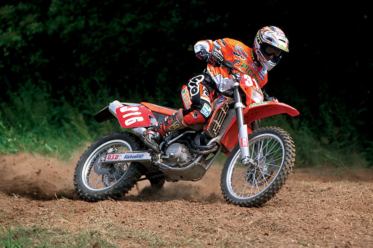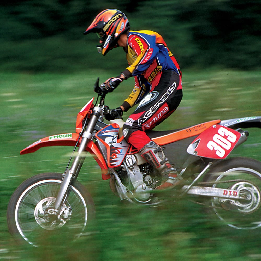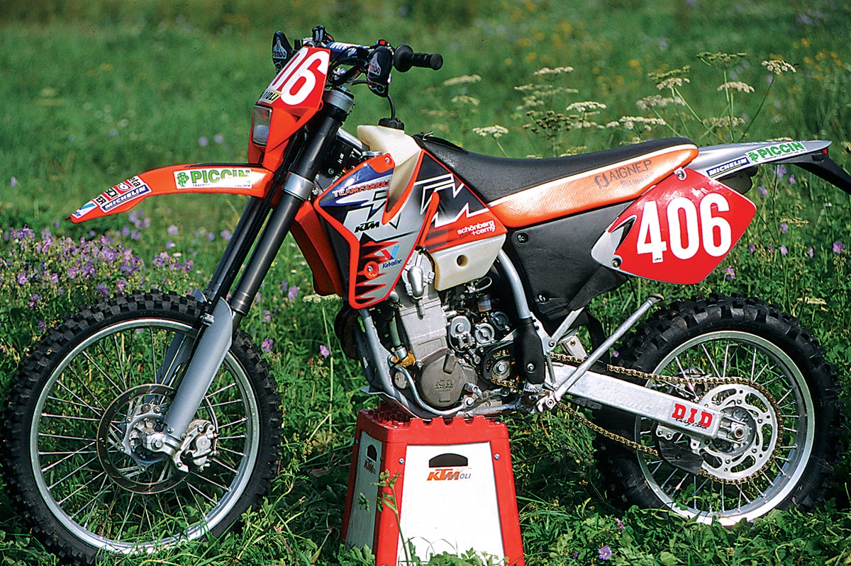 Back in 1999, KTM was a two-stroke company. The LC4 was a playbike that had been hammered into a racing role by a few passionate engineers, riders and mechanics, but it was dated and the arrival of the Yamaha YZ400F forced KTM to act quickly. The quick solution was to buy Husaberg and use that company’s technology to jump-start a new program of Racing Four-Strokes (appropriately named the “RFS” engines). In 1999, KTM raced the World Enduro Championship on prototype four-strokes and won the 400 class, Then they invited Dirt Bike to the site of the final round to ride the prototypes. Here is what we said in the October, 1999 issue.