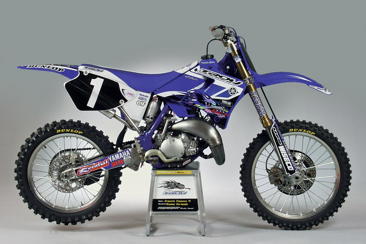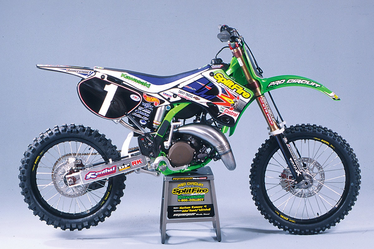 In the April, 2000 print edition of Dirt Bike Magazine, we got the chance to ride a bunch of National Championship works bikes. In two of the cases, the riders who won those championships never got to ride the bikes for themselves–at least, not with their number one plates. Ricky Carmichael was the 125 outdoor champion and he was moving up to the 250 class. Nate Ramsey was 125 West champ and he was injured. Here’s what we said about those bikes as well as Greg Albertyn’s RM250 and Ernesto Fonseca’s Yamaha of Troy YZ125.