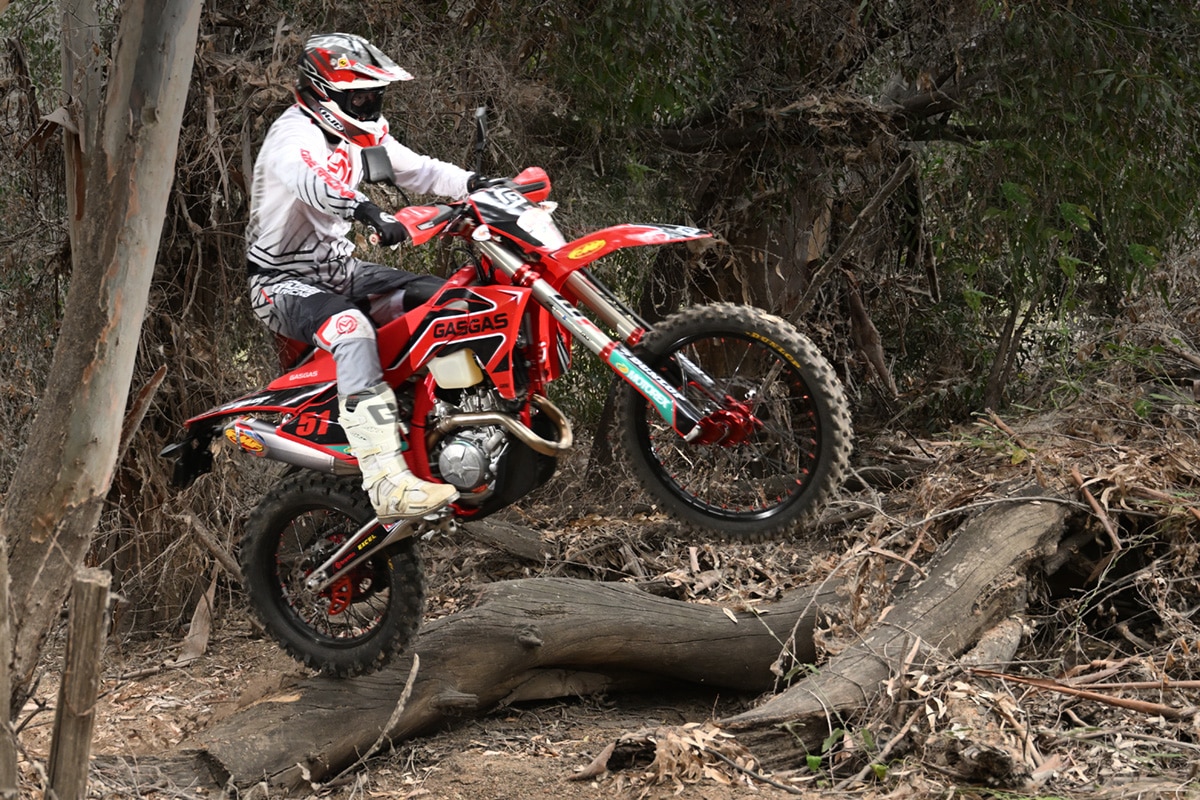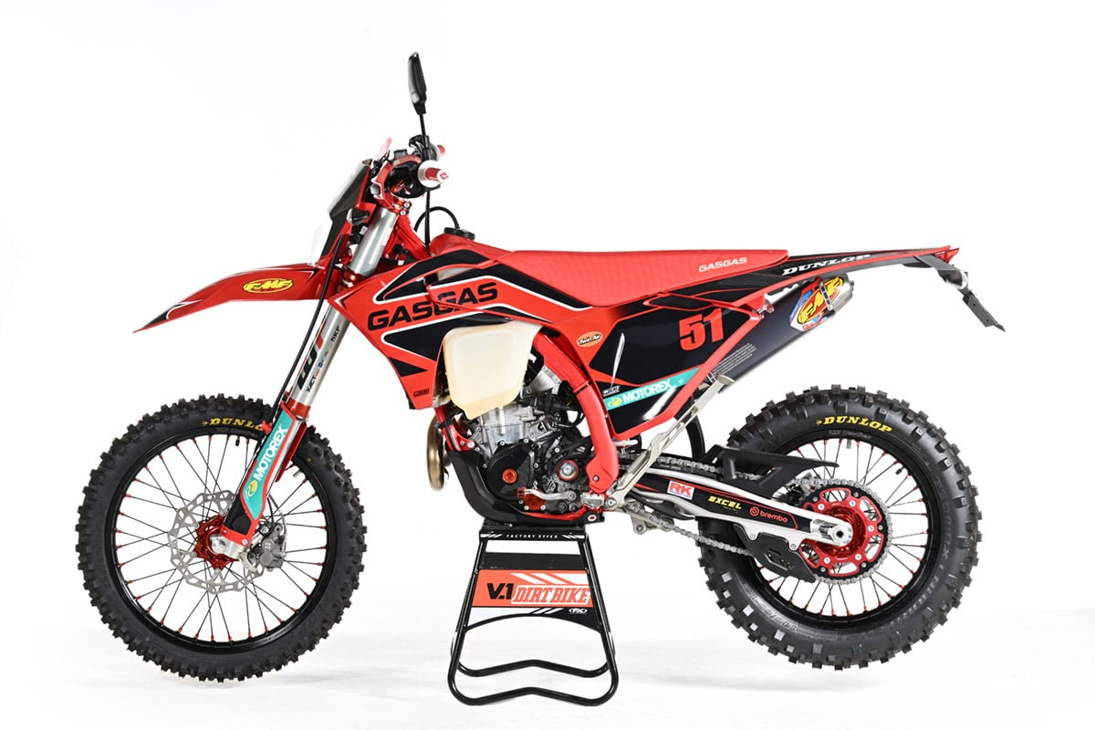 Our senior-most test rider Pete Murray is actually in the process of doing just that. He’s buying a 2025 KTM 350EXC through Langston Motorsports. He’s sworn not to reveal the price, but he was very interested in this GasGas project. The essential elements are WP Xact Cone Valve fork and an XPLOR Pro 6746 Shock. It also got split triple clamps, a pro wheelset and an FMF Q4 muffler.