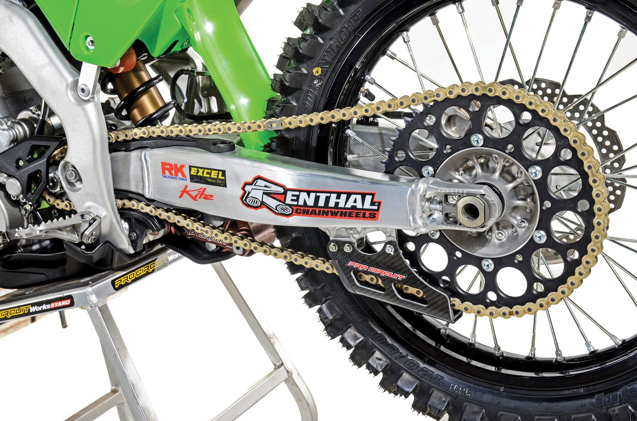 Even legendary suspension tuners agree that setting a bike up for off-road racing is one of the hardest things to do. A big component in the suspension setup is a complete Pro Circuit rear linkage system that is designed to be softer in the initial part of the stroke to provide a plusher feel on smaller hits and then ramps up the stiffness as the shock goes deeper in the stroke. This change allows for the use of softer high-speed valving lessoning any harsh feel and minimizing deflection.