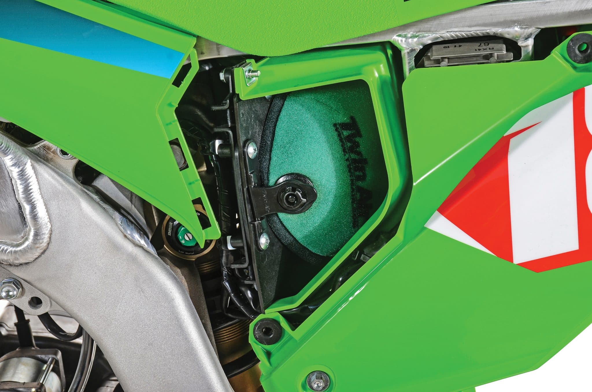 Although it looks the same as what comes on the SR, the Pro Circuit exhaust is different internally, having a larger diameter core similar to what Pro Circuit uses for AMA amateur racing. No changes were made to the head pipe. A complete Twin Air Powerflow system increases the airbox volume, and the slightly larger surface of the high-flowing air filter allows more air into the engine.