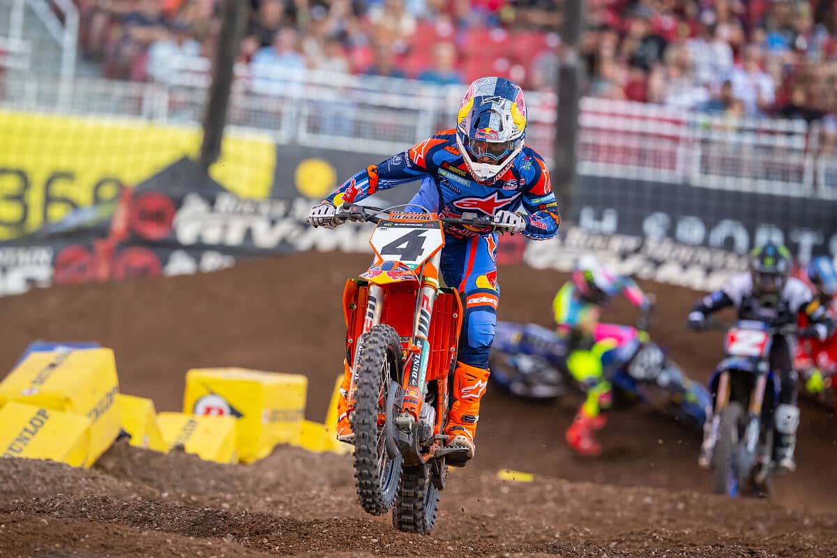 Cooper Webb rode a calculated main event to capture his third career Monster Energy Supercross Championship with a fourth place finish in the 2025 series conclusion at Salt Lake City. Chase Sexton was unquestionable the fastest rider of the day and perhaps even the entire season, but he could only do so much in the final race. He passed Webb for the lead fairly early in the main and then stretched out an impressive lead. Webb fell back behind Malcolm Stewart and Justin Cooper to maintain a 2-point advantage in the final tally. The 250 class presented the two regional divisions with a chance to measure themselves against each other in the Dave Coombs East-West Showdown. Haiden Deegan had already captured the Western Division, but it was game-on for the eastern riders. While Deegan checked out with the lead of the main event, second place was a chaotic clash between Tom Vialle, Seth Hammaker and RJ Hampshire for the east title, with Julian Beaumer acting as a random spoiler from the west. After considerable drama, Vialle emerged with third on the day and the Eastern Championship. For a review of the 2025 Monster Energy Supercross season, click here.